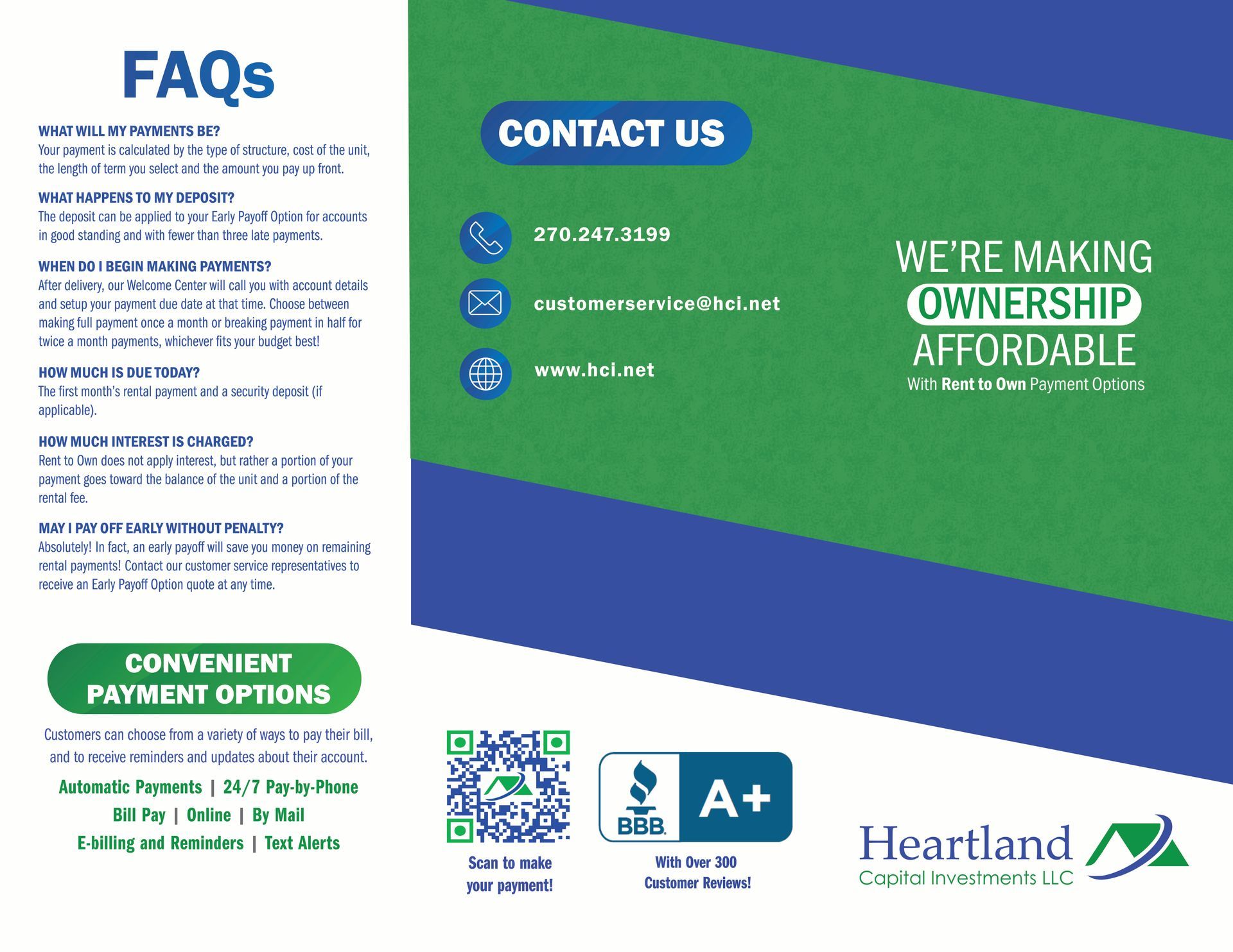 Heartland will provide one 6.5' x 2.5' vinyl banner, one 18" x 24" coroplast Rent to Own Yard sign, a table tent and pack of customer-facing brochures to each dealer. Please contact your Territory Manager for more information.